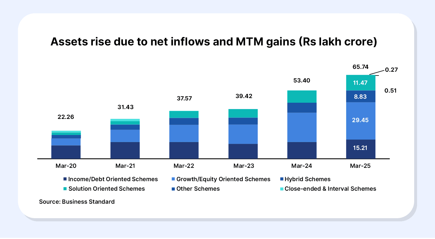 Kotak’s multi-asset strategy and Large-Cap Equity are key for long-term wealth creation. By 2026, Indiaโs structural growth will boost earnings, benefiting these funds from a broad corporate profit recovery. Here is how total assets invested in mutual funds have grown in the past five years.